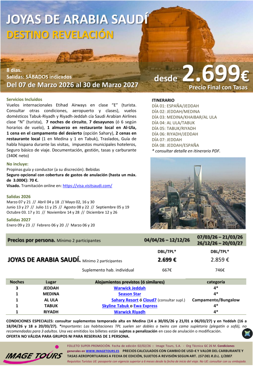 Joyas de ARABIA SAUDI 2026-2027, circuito con todas las visitas y noche en desierto, 8 días desde 2.699€
