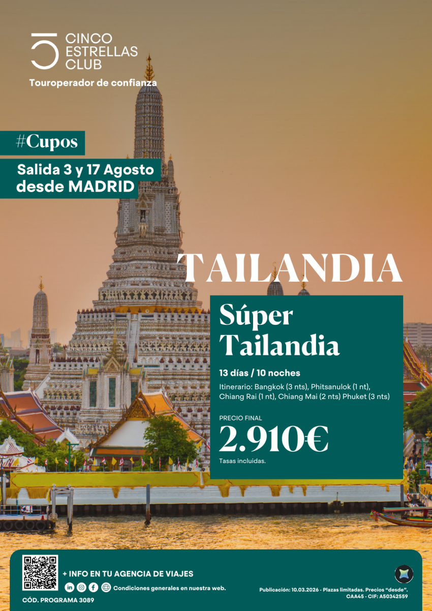 Cupos | Súper Tailandia 13ds/10ns dsd 2.910€ salidas 3 y 17 agosto desde Madrid