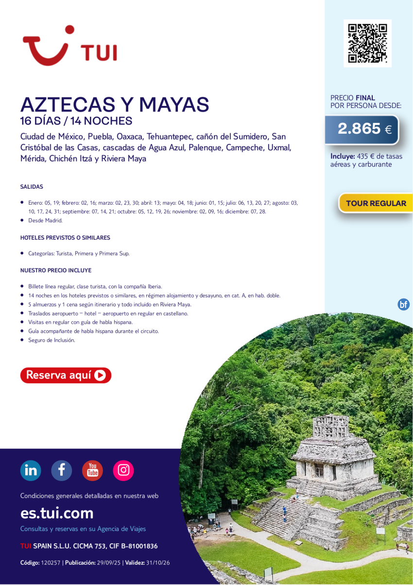 México. Aztecas y Mayas. 16 días / 14 noches. Tour Regular. Desde MAD desde 2.865 €