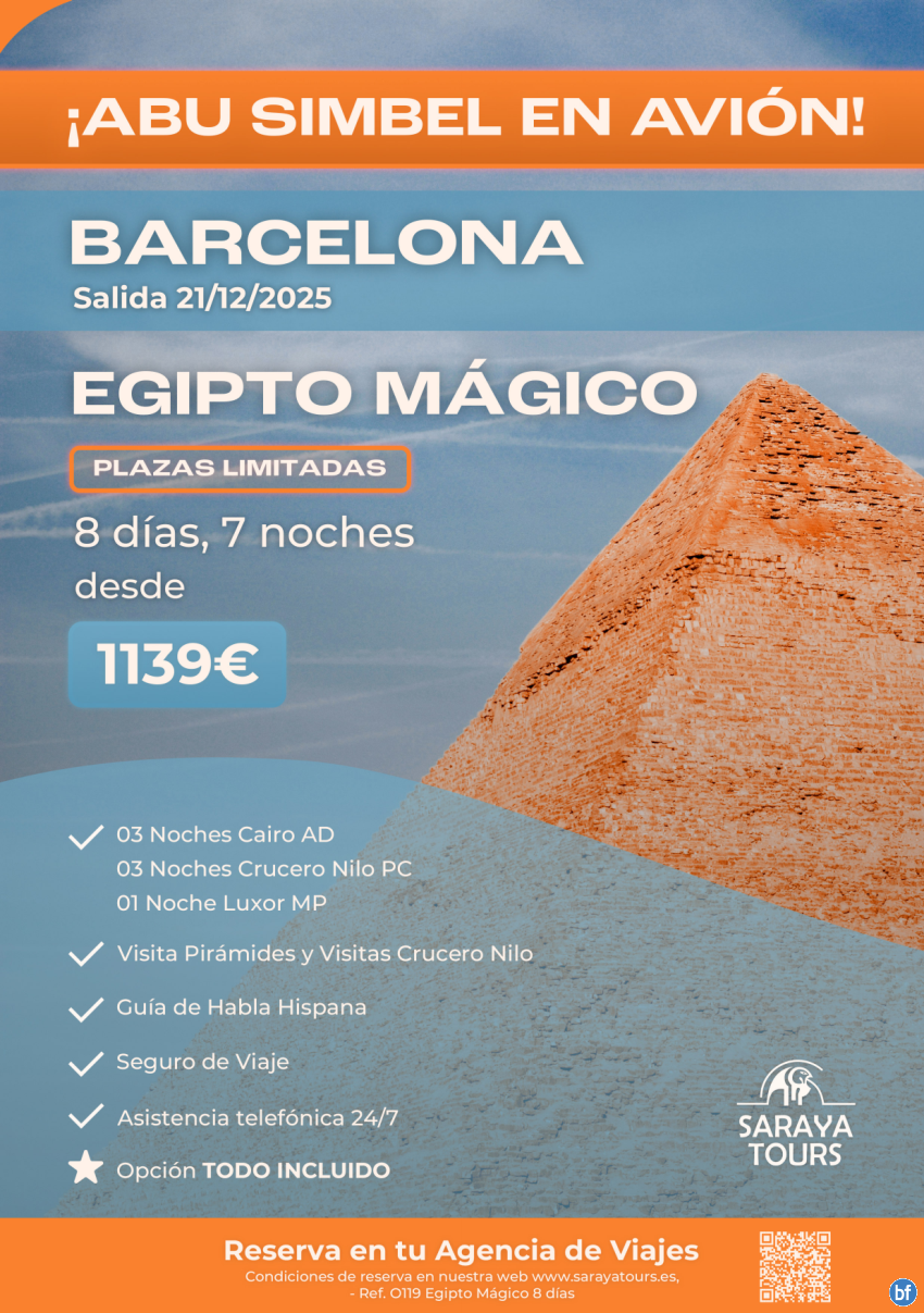Especial Egipto Mágico con Abu Simbel en avión incluido desde Barcelona. Salida 21/12/25. Plazas limitadas.