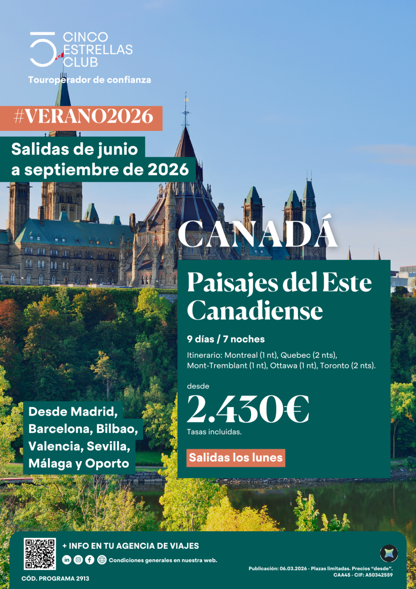 Verano'26 Paisaj. Este Canadiense 9d/7ns dsd 2.430€ sal.lunes dsd junioasept dsdMad,Bcn,Bio,Vlc,Svq,Agp,Opo